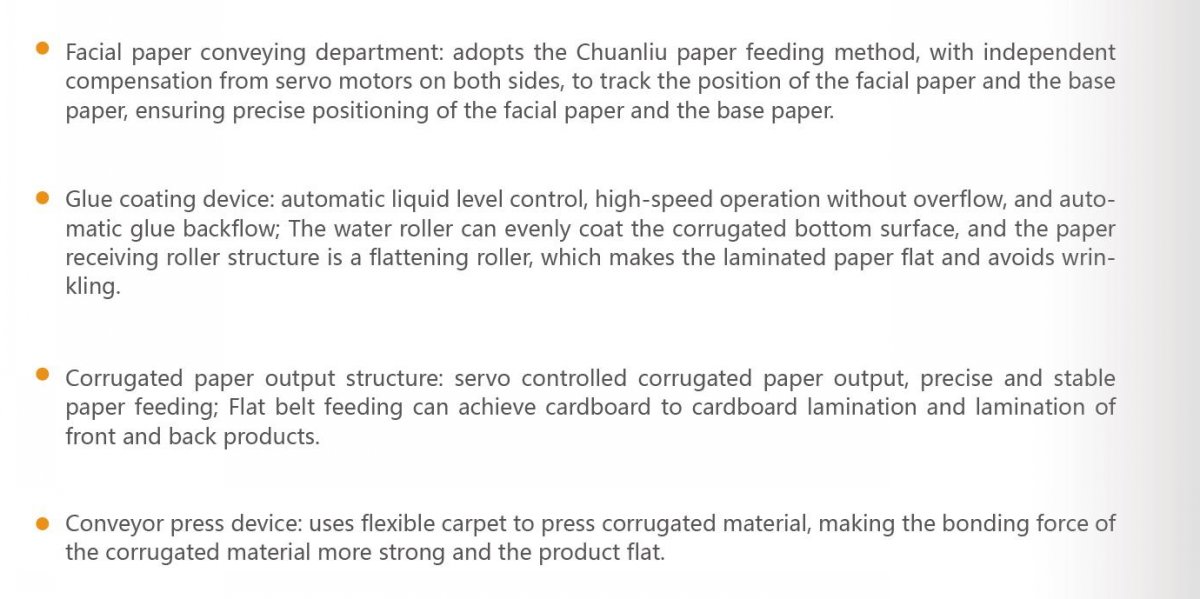 ●瓦楞出纸结构:伺服控制瓦楞出纸,送纸精确稳定;平带送纸可实现卡纸对卡纸裱贴及裱正反面产品。