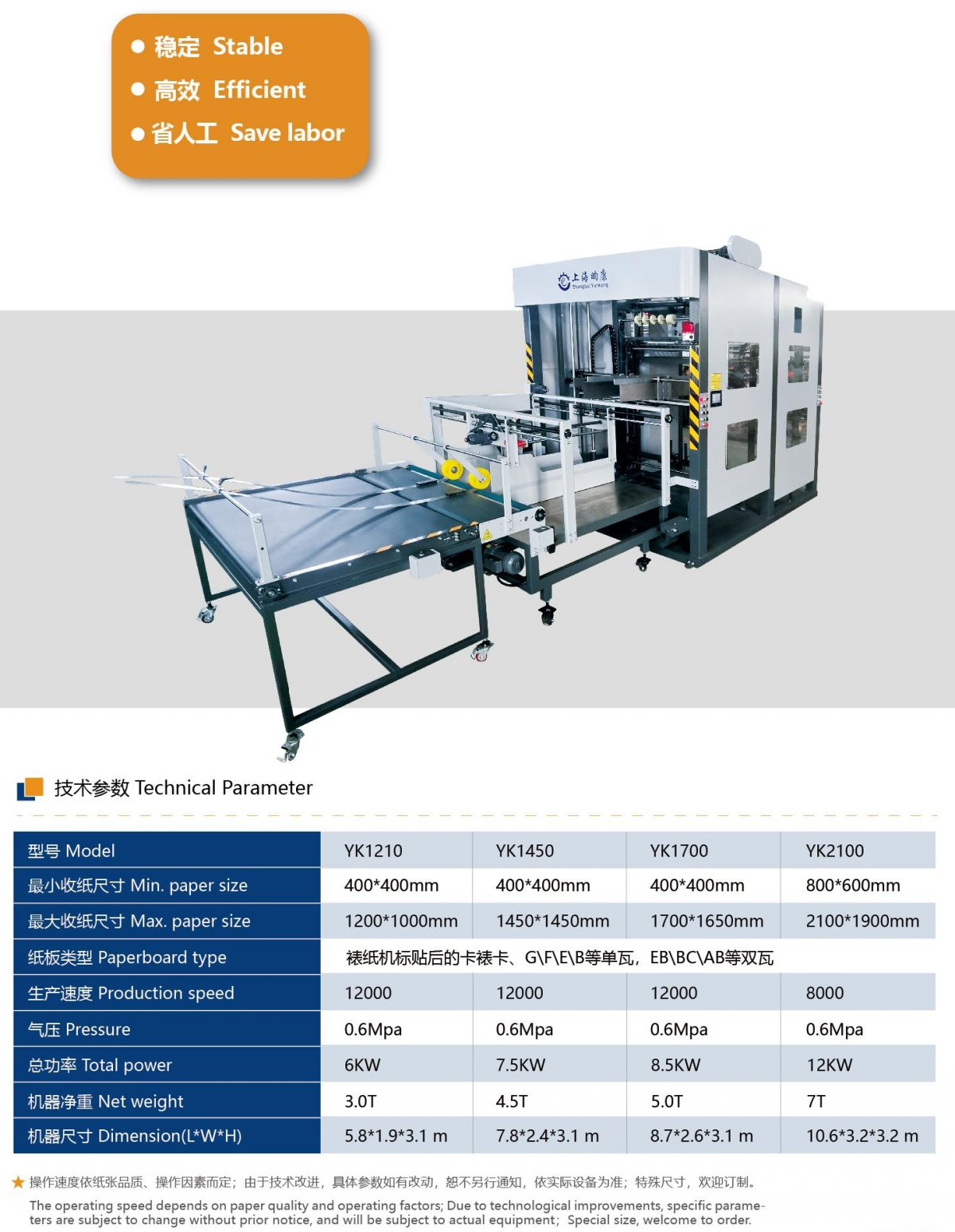 ●高速度:速度可达12000张/时。 ●智能化: -键调机,易于操作。 ●高适应:与裱纸机对接,自动翻转码垛各类型彩裱纸板。 ●高稳定:整机稳定高效,故障率低,可大幅降低劳动强度,节省人工,提高生产效率。