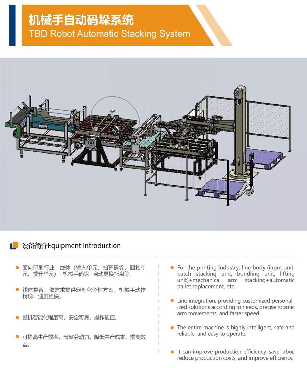 ●面向印刷行业:线体(输入单元、拍齐码垛、捆扎单元、提升单元) +机械手码垛+自动更换托盘等。 ●线体整合,依需求提供定制化个性方案,机械手动作精确,速度更快。 ●整机智能化程度高,安全可靠,操作便捷。 ●可提高生产效率,节省劳动力,降低生产成本,提高效益。